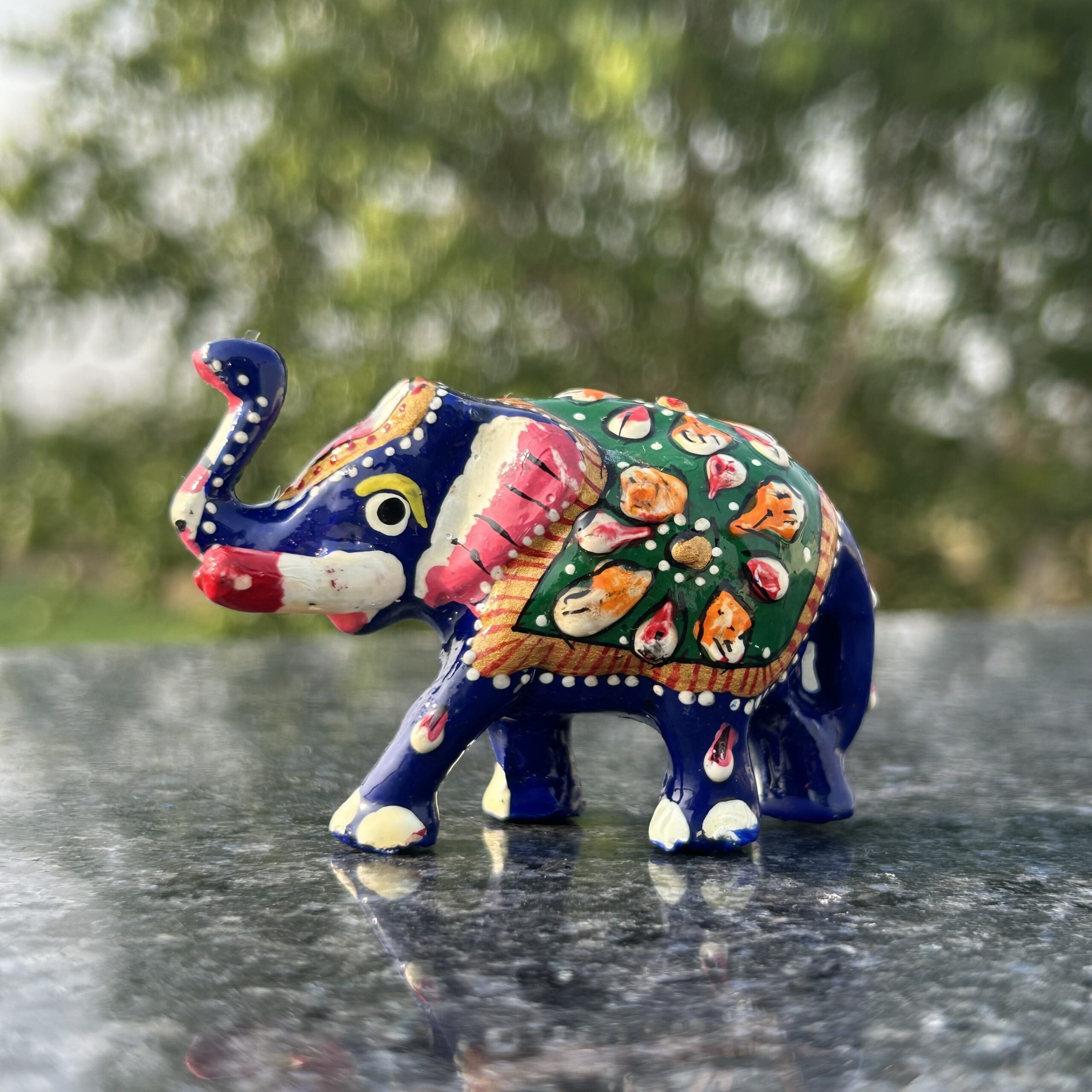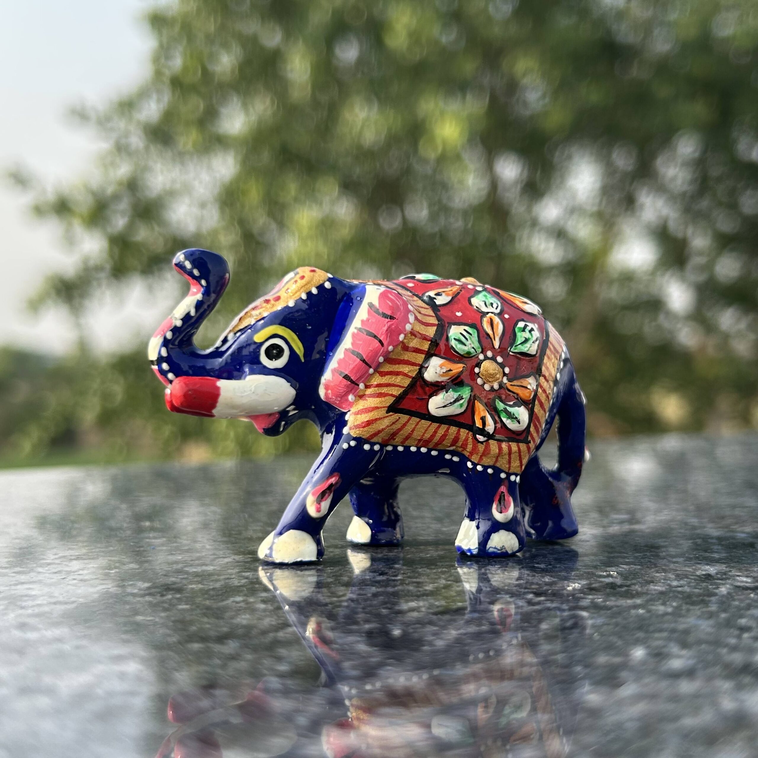 Hand-painted Metal elephant figurine crafted by Rajasthani artisans. Featuring vibrant colors and intricate floral designs, this decorative piece adds a touch of traditional Indian charm to your home. Perfect for gifting, décor, or spiritual symbolism.