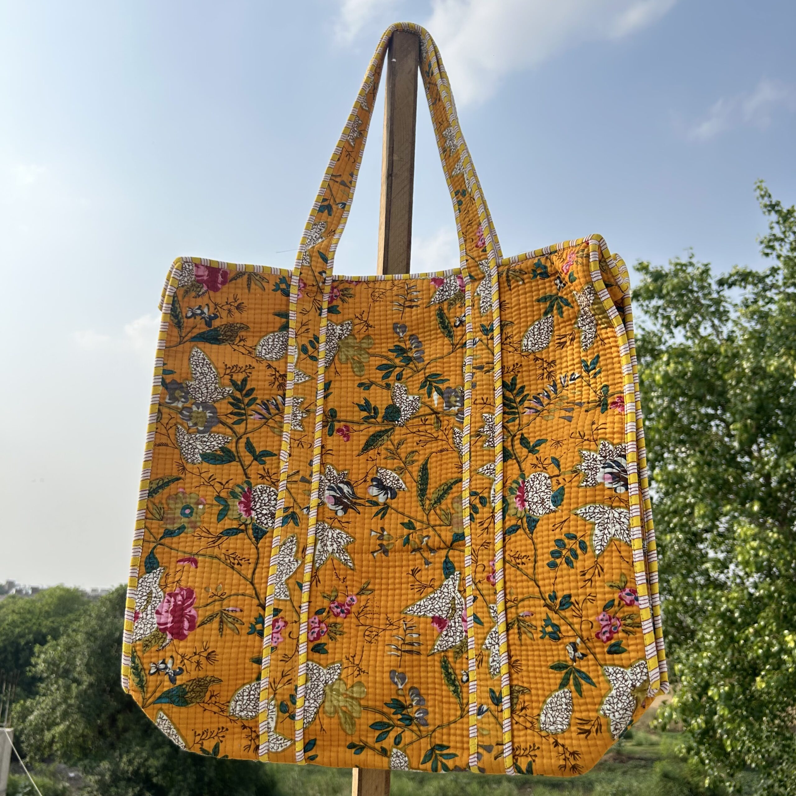 Handmade Jaipuri quilted tote bag with vibrant floral print, crafted from pure cotton and comes with Zipper Closer. Lightweight, eco-friendly, and perfect for shopping or daily use.
