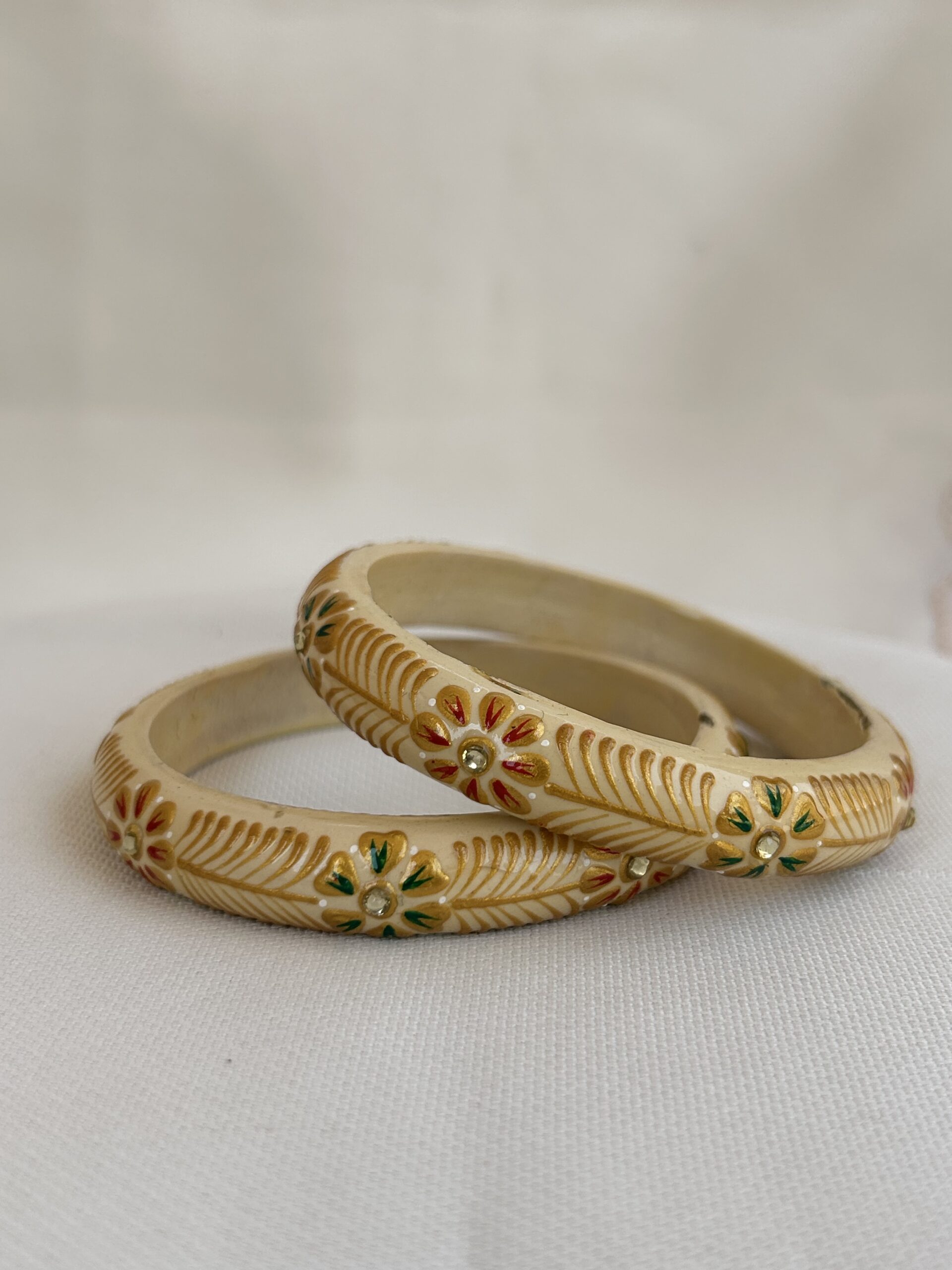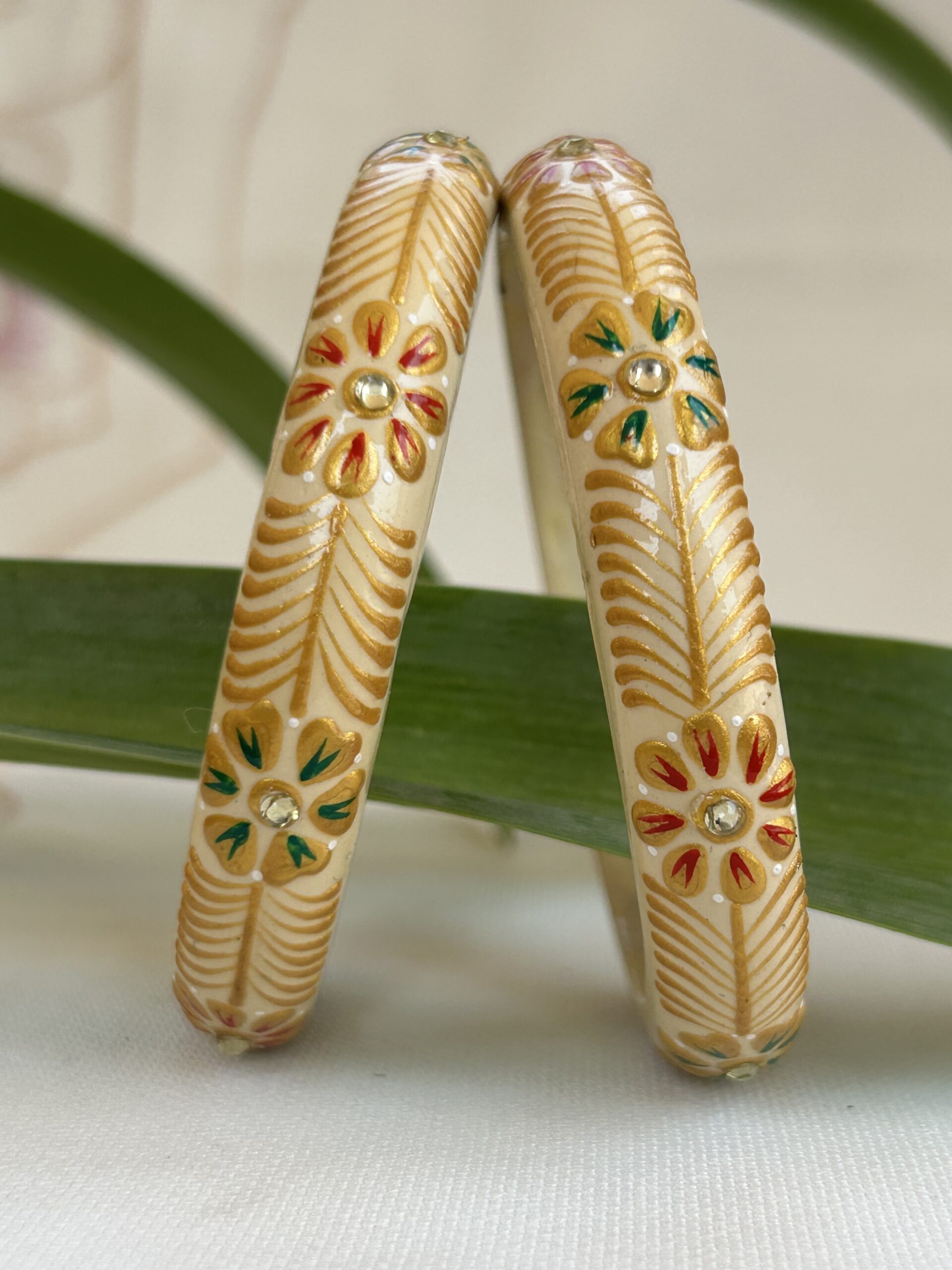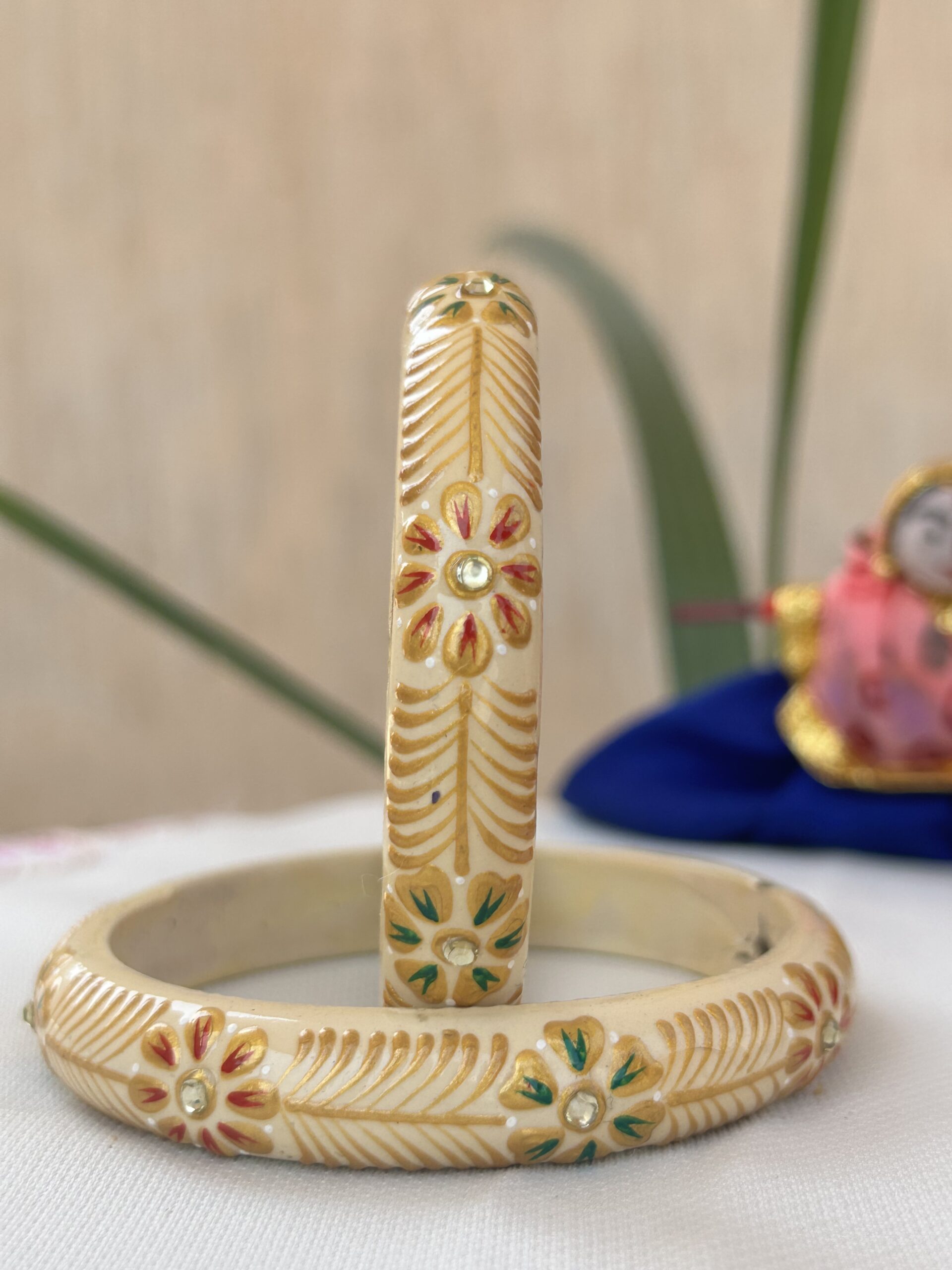 Jaipuri Handmade Hand-Painted Lac Bangles – Beige Floral Design with Golden Detailing and Stone Accents
